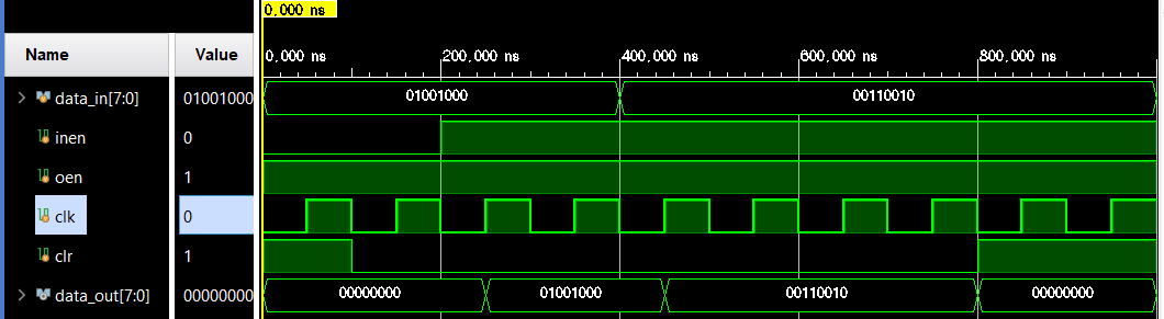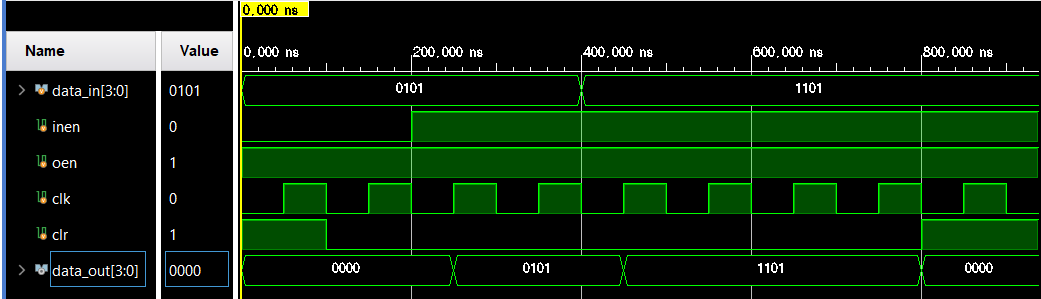 posedge 에서 register 값이 갱신되는 것을 볼 수 있다. 또한 inen, oen 제어신호 통해 input,output을 제어할 수 있다.