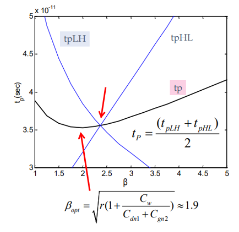 이 정의에 의하면 inverter의 경우 beta ratio가 1.9일 때 최소이다. 하지만 이는 오직 speed를 고려한 것이고, falling, rise모두 잘 동작하려면 tp는 tpHL과 tpLH중 큰 값에 맞춰야한다. 따라서 tpLH = tpHL인 점을 정해야한다.