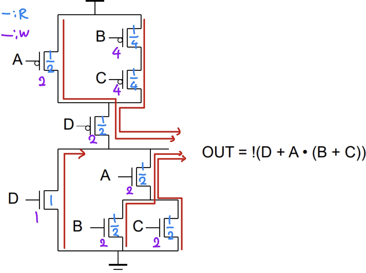 지금까지 mosfet의 width와 delay의 관계를 알아보았다. 지금부터는 CMOS를 구성하는 PMOS와 NMOS의 비율을 어떻게 정하는지에 관해 알아보겠다.